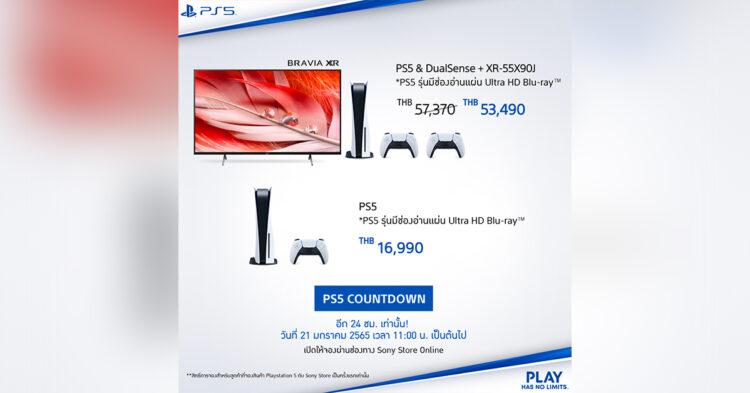 โซนี ประเทศไทย เตรียมเปิดให้สั่งซื้อ Sony PlayStation 5 อีกครั้งในวันที่ 21 มกราคม 2565 เวลา 11.00 น. เป็นต้นไป ผ่านช่องทางออนไลน์ https://bit.ly/PS5Jan2022 โดยมีราคาเริ่มต้น 16,990 บาท