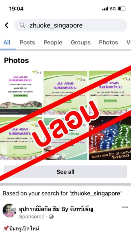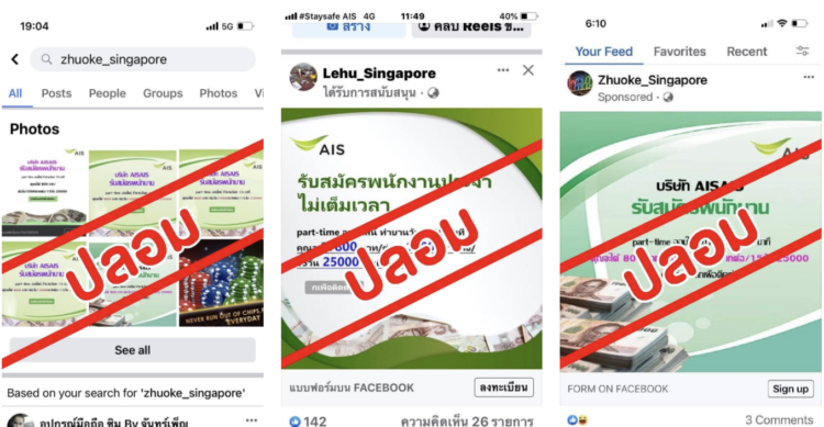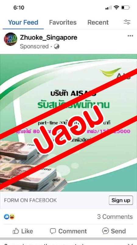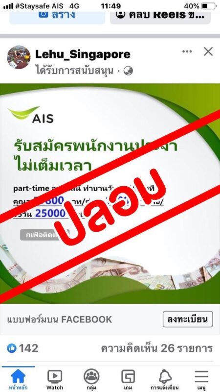จากกรณีที่กลุ่มมิจฉาชีพได้มีการส่งต่อ link และรูปภาพการรับสมัครงาน โดยแอบอ้างชื่อ AIS ผ่านทาง online อาทิ เฟสบุ๊ค ในหลากหลายรูปแบบในช่วงที่ผ่านมานั้น บริษัทฯ ขอเรียนยืนยันว่า AIS ไม่เคยมีลักษณะของการรับสมัครงานในรูปแบบดังกล่าว ดังนั้น จึงขอแจ้งเตือนประชาชนว่า อย่าหลงเชื่อและกด link เข้าไปให้ข้อมูลอย่างเด็ดขาด เพราะอาจจะเกิดความเสี่ยงในการถูกมิจฉาชีพเชื่อมต่อไปยังข้อมูลส่วนบุคคลได้
