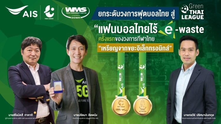 หลังจากที่ AIS ได้ร่วมเป็นพันธมิตรกับสมาคมกีฬาฟุตบอลฯ และ ไทยลีก ยกระดับวงการฟุตบอลไทยไปอีกขั้น ด้วยการถ่ายทอดสดศึกไทยลีกในฤดูกาล 2021-2022 ให้แฟนบอลชาวไทยสามารถชม เชียร์ ทีมที่รักแบบจุใจเต็มอิ่มบน AIS PLAY แล้ว ครั้งนี้ AIS ขออาสาลุกขึ้นมาสร้างปรากฏการณ์ใหม่ให้กับวงการฟุตบอลไทยอีกครั้ง ให้ไทยลีกกลายเป็นการแข่งขันที่ยั่งยืน ผ่านการมีส่วนร่วมของแฟนบอลชาวไทยทั่วประเทศ โดยความร่วมมือระหว่าง “ไทยลีก” ผู้จัดการแข่งขันฟุตบอลลีกสูงสุดของไทย และ บริษัท เวสท์ แมเนจเม้นท์ สยาม จำกัด หรือ WMS ผู้นำด้านการจัดการของเสียทุกประเภทอย่างครบวงจร มาร่วมยกระดับสู่การเป็น Green ไทยลีก นำร่องโครงการ แฟนบอลไทยไร้ E-Waste ชวนทิ้งขยะอิเล็กทรอนิกส์กับ AIS เพื่อนำไปผลิตเป็น “เหรียญจากขยะอิเล็กทรอนิกส์” ครั้งแรกของวงการกีฬาไทย สำหรับรางวัลเกียรติยศมอบให้กับสโมสรที่มีหัวใจรักษ์โลก ก่อนจะขยายผลไปสู่กิจกรรมความยั่งยืนด้านอื่นๆ ในขั้นตอนต่อไป เพื่อยกระดับมาตรฐานวงการฟุตบอลไทยสู่การแข่งขันที่ยั่งยืน