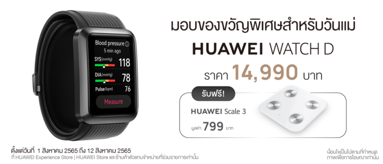 HUAWEI WATCH D วางจำหน่ายในประเทศไทยที่ราคา 14,990 บาท พิเศษ! รับทันที HUAWEI Scale 3 มูลค่า 799 บาท เมื่อซื้อตั้งแต่วันที่ 1 สิงหาคม 2565 – 12 สิงหาคม 2565 ที่หน้าร้าน HUAWEI Experience Store และร้านค้าที่ร่วมรายการ รวมถึงช่องทางออนไลน์อย่าง HUAWEI Store และร้านค้าอย่างเป็นทางการของหัวเว่ยบน Shopee, Lazada และแอปพลิเคชัน My HUAWEI และศึกษาข้อมูลผลิตภัณฑ์เพิ่มเติมได้ ที่นี่