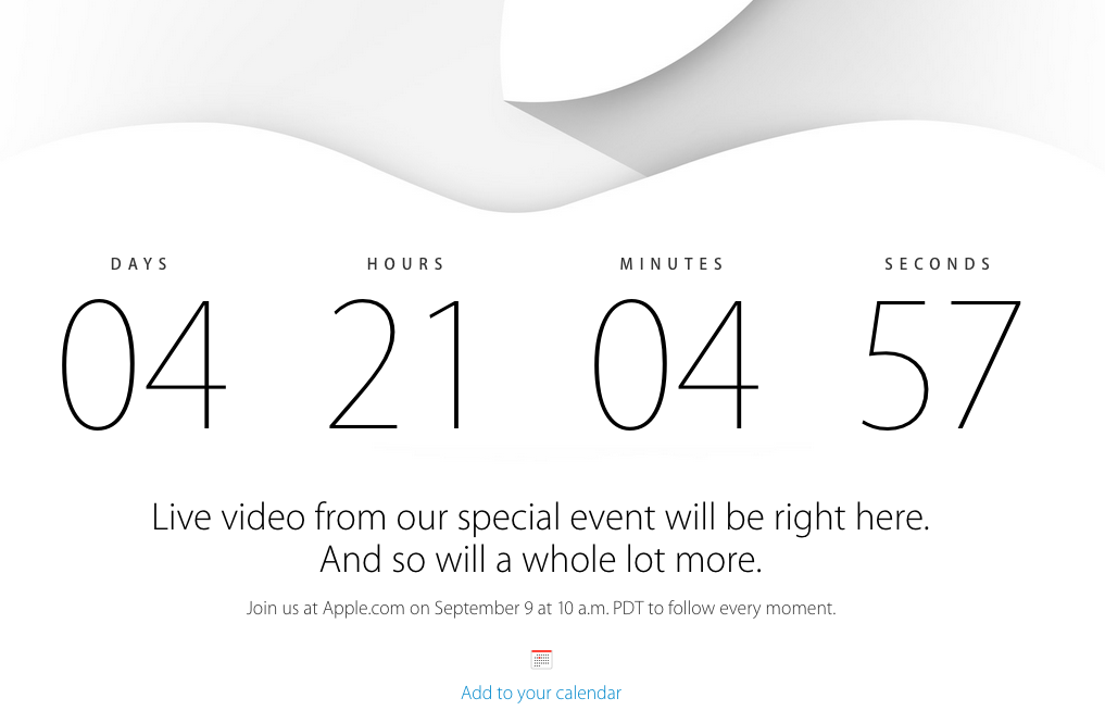 Apple ได้เพิ่มหน้าพิเศษบนเว็บที่ใช้ในการถ่ายทดสดงานเปิดตัวสินค้าใหม่ในวันที่ 9 กันยายนที่จะมาถึงอย่างเป็นทางการแล้วโดยตอนนี้ขึ้นหน้านับถอยหลังวันเปิดตัวทางการประมาณอีก 4 วัน โดยงานจะเริ่มในเวลา 10:00 น. ตามเวลาท้องถิ่นหรือประมาณเที่ยงคืนของประเทศไทยซึงในงานนี้คาดว่าจะได้เห็น iPhone 6 ทั้ง 2 ขนาดหน้าจอ แต่จะพ่วง iWatch และ iPad รุ่นใหม่ด้วยหรือไม่ต้องติดตามกันอีกทีในวันงาน โดยทีมงาน @flashfly เตรียมรายงานสดเช่นเคย