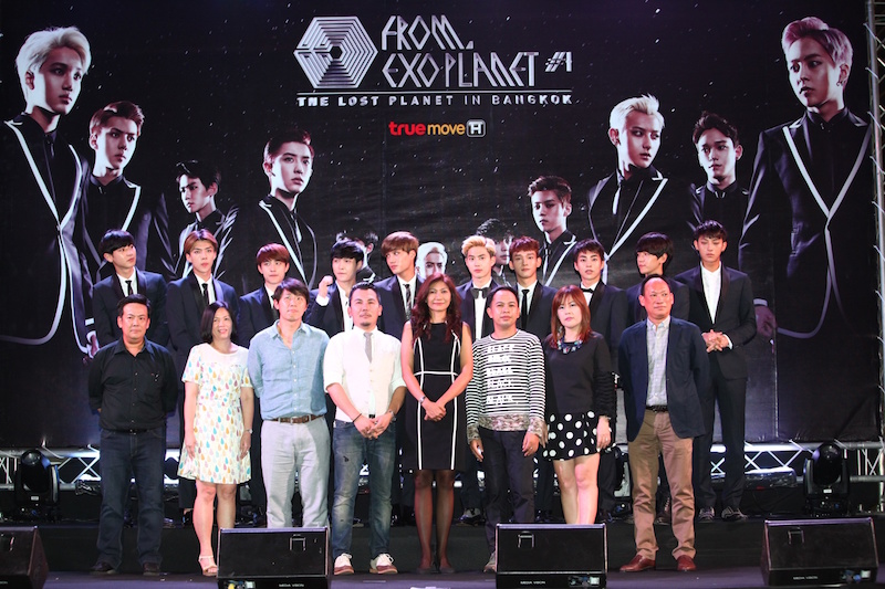 ทรูมูฟ เอช ผู้ให้บริการ 3G, 4G ครอบคลุมที่ 1 ทั่วไทย โดยนายธีรศักดิ์ อรุณเริ่มวัฒนะ (แถวหน้า – ขวา) ผู้อำนวยการกลุ่ม ด้านการสื่อสารเพี่อสร้างแบรนด์และบริหารสื่อโฆษณา บริษัท ทรู คอร์ปอเรชั่น จำกัด (มหาชน) ในฐานะผู้สนับสนุนหลัก คอนเสิร์ต “TrueMove H presents EXO FROM EXOPLANET #1 – THE LOST PLANET – in BANGKOK” มอบช่อดอกไม้ต้อนรับศิลปิน EXO 10 หนุ่มสุดยอดบอยแบนด์นัมเบอร์ 1 จากแดนกิมจิที่บินมาเปิดแสดงคอนเสิร์ตให้แฟนคลับและลูกค้า ทรูมูฟ เอช ได้สัมผัสใกล้ชิด ครั้งแรกในไทย เมื่อเร็ว ๆ นี้