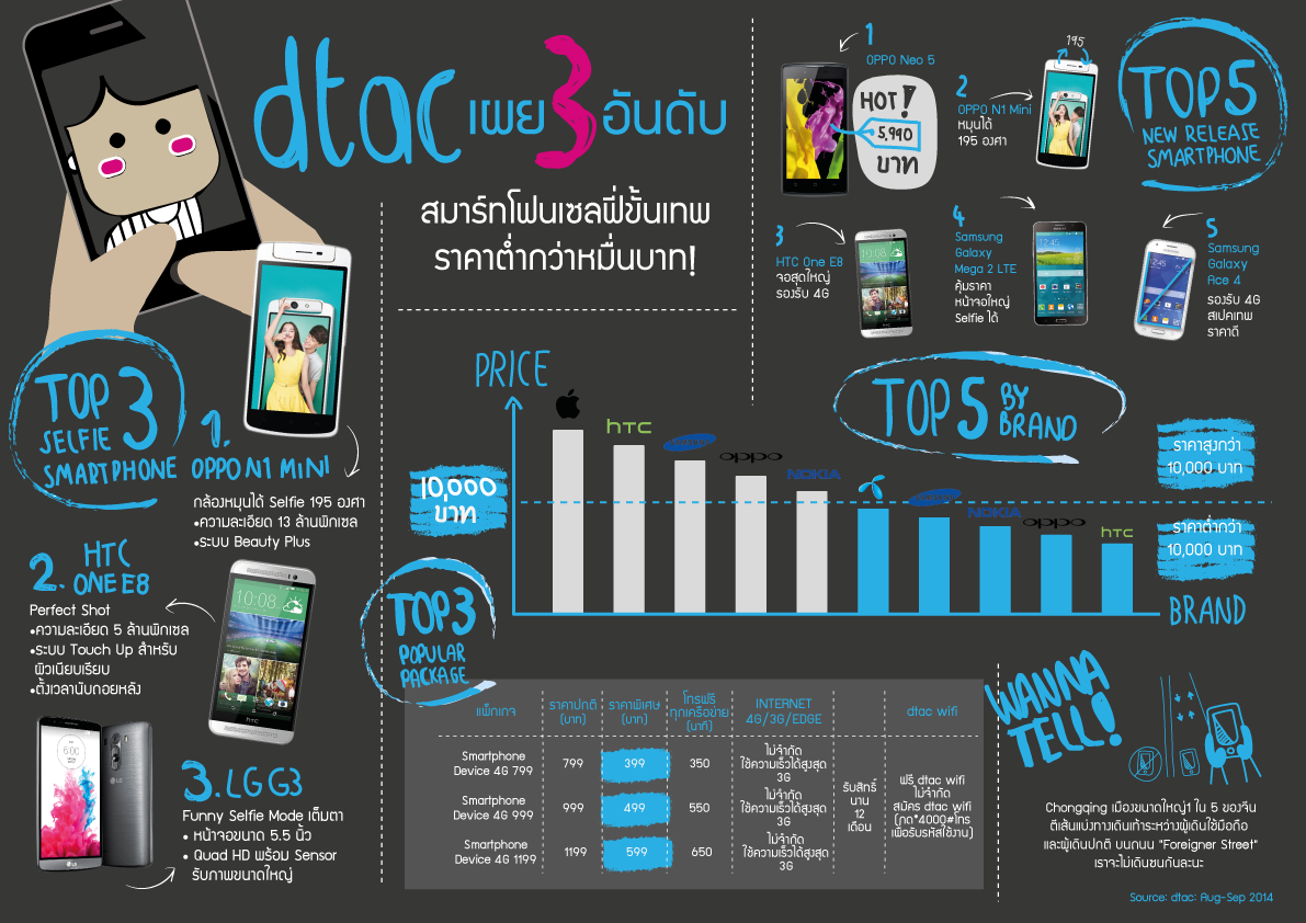 จากการรวบรวมข้อมูลยอดขายสมาร์ทโฟนของดีแทคในช่วงเดือนสิงหาคม – กันยายน 2557 พบว่ามีข้อมูลที่น่าสนใจคือ