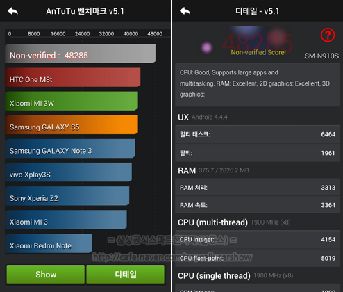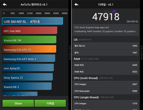 จากผลการทดสอบนั้น Galaxy Note Edge ที่ใช้ Exynos ได้คะแนนไปเกือบ 48,000 คะแนน ส่วน Galaxy Note 4 ได้คะแนนไปสูงกว่า 48,000 คะแนนเล็กน้อย อย่างไรก็ตามการทดสอบนี้ไม่ได้คำนึงถึงการทำงานแบบ multi-core และความเร็วของ ram ซึ่งหากคำนึงถึง multi-core แล้ว Exynos 5433 ที่สามารถรันทั้ง 8 คอร์ให้ทำงานพร้อมกันได้ทั้งหมดก็อาจจะเอาชนะ Snapdragon ไปได้