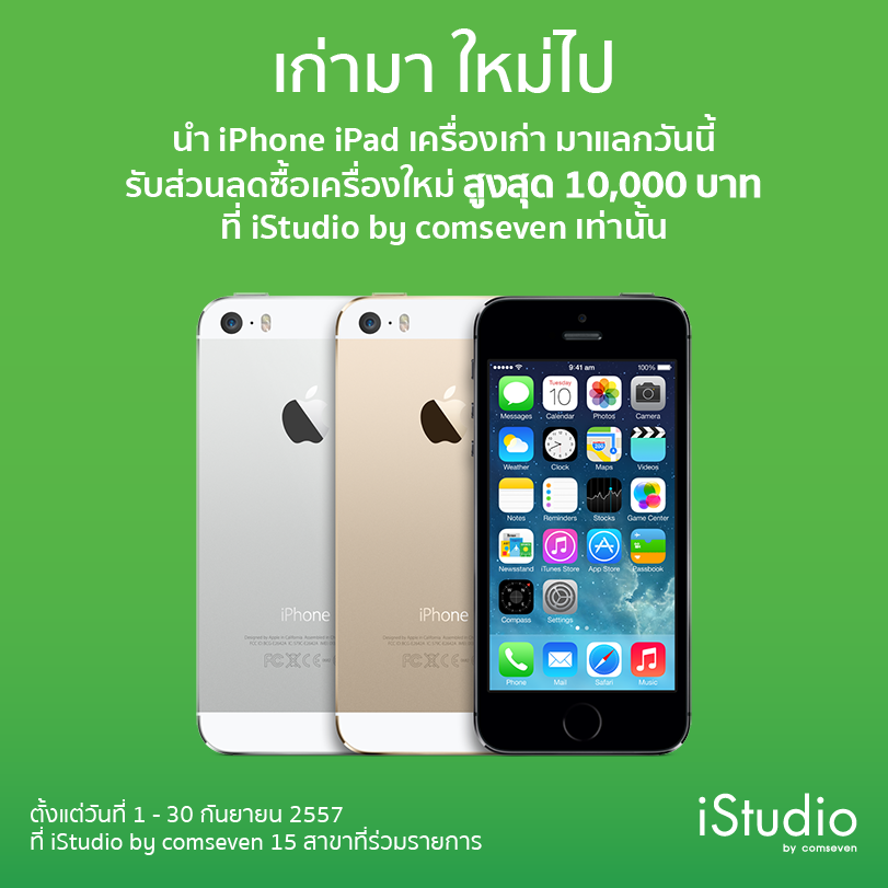 “เก่ามา ใหม่ไป” ให้คุณนำ iPhone หรือ iPad เครื่องเก่ามาแลกเป็นส่วนลดเพื่อซื้อ iPhone iPad รุ่นใหม่ พร้อมข้อเสนอสุดคุ้มให้มูลค่าเครื่องเก่า สูงสุดถึง 10,000 บาท ที่ iStudio by comseven ทั้ง 15 สาขาที่ร่วมรายการ ตั้งแต่วันนี้ – 30 กันยายน 2557