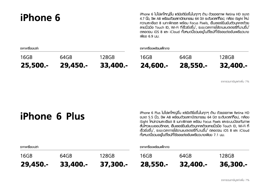 - iPhone 6 ความจุ 128GB ราคา 33,400 (ราคาเดิม 33,435) เครื่องพร้อมแพคเกจราคา 32,400 (ราคาเดิม 32,610)