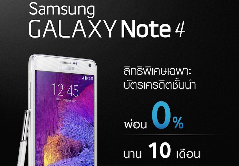 ซัมซุงร่วมต้อนรับเทศกาลแห่งความสุขด้วยการมอบข้อเสนอสุดพิเศษ ให้เป็นเจ้าของสมาร์ทโฟนรุ่นสุดยอด “ซัมซุง กาแลคซี่ โน้ต 4 (Samsung Galaxy Note 4)” ที่มากับปากกา S Pen อันเป็นเอกลักษณ์ หน้าจอ Quad HD Super AMOLED ขนาด 5.7 นิ้ว ดีไซน์หรู สุดพรีเมี่ยม แข็งแรงทนทานด้วย กรอบโลหะ พร้อมกล้องหน้าความละเอียดสูงถึง 3.7 ล้านพิกเซล และฟีเจอร์ Wide-selfie ที่น่าตื่นตาตื่นใจ ด้วยโปรโมชันกับสิทธิ์ผ่อน 0% นาน 10 เดือน จากบัตรเครดิตชั้นนำ*