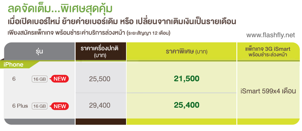 มาอีกครั้งกับโปรโมชั่น AIS Super Deal ที่ครั้งก่อนได้ลดราคา iPhone 6 และ iPhone 6 Plus ความจุ 16GB ลงถึง 3,000 บาท เมื่อติดสัญญา 12 เดือน พร้อมแพคเกจ 599 บาทขึ้นไป ดูเหมือนจะยังไม่สะใจทาง AIS เลยจัดแบบพิเศษลดราคาค่าเครื่องให้ 4,000 บาทเมื่อเปิดเบอร์ใหม่ ย้ายค่ายหรือเปลี่ยนจากเติมเงินเป็นรายเดือน พร้อมติดสัญญา 12 เดือนและชำระค่าบริการแพคเกจ 3G iSmart 599 ล่วงหน้า 4 เดือน