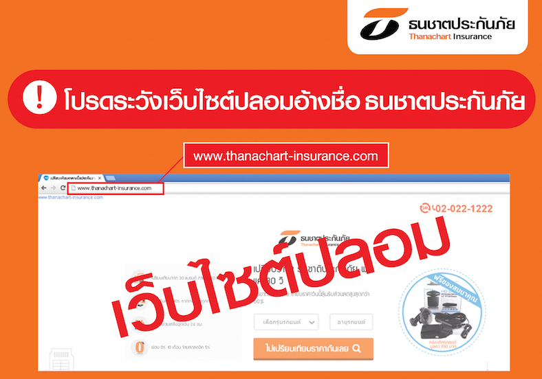 ธนชาตประกันภัย เตือนลูกค้าประชาชนโปรดระวังเว็บไซต์ปลอมจากมิจฉาชีพ ในการซื้อขายกรมธรรม์ออนไลน์ ย้ำควรตรวจสอบและสังเกตชื่อเว็บไซต์ว่าเป็นของบริษัทฯจริง (www.thanachartinsurance.co.th) ก่อนทำรายการธุรกรรมซื้อขายกรมธรรม์ทุกครั้ง