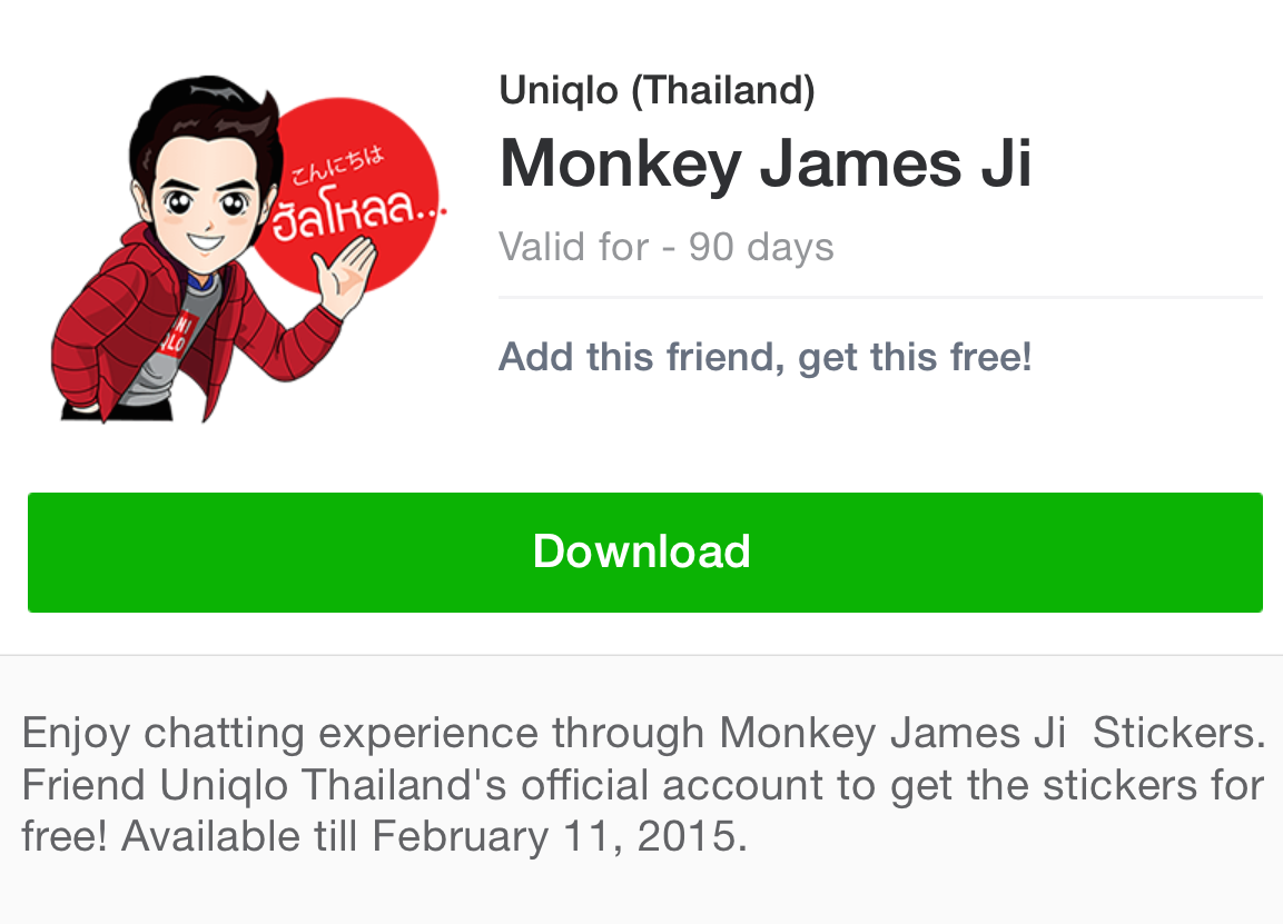 วันนี้ LINE ประเทศไทยได้ปล่อยสติกเกอร์ Monkey James Ji จาก UNIQLO สุดน่ารักแสนซนที่นำเอาคาแรคเตอร์ของของลิงน้อยเจมส์-จิรายุ ตั้งศรีสุข แบรนด์แอมบาสเดอร์ของ UNIQLO พร้อมข้อความสุดฟินมากมายสำหรับหลากหลายโอกาสให้ได้เลือกใช้กันอย่างสนุกสนาน สามารถดาวน์โหลดได้ฟรีตั้งแต่วันนี้ถึง 11 กุมภาพันธ์ 2558 นี้ โดยต้องเพิ่ม UNIQLO Thailand Official LINE เป็นเพื่อนก่อนเท่านั้น