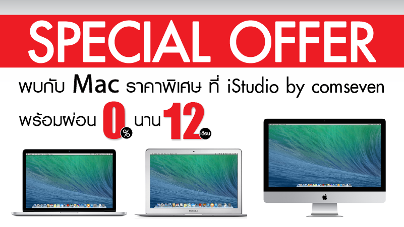 พบกับ โปรโมชั่น Mac ราคาสุดพิเศษ กับส่วนลดตั่งแต่ 8,000 – 16,000 บาท หลากหลายรุ่น อาทิ MacBook Air, MacBook Pro จอภาพ Retina และ iMac รุ่นปี 2013* พร้อมให้คุณผ่อนสบายๆ 0% นานสูงสุด 12 เดือนกับธนาคารที่ร่วมรายการ ที่ iStudio by comseven สาขาที่ร่วมรายการ เริ่มตั้งแต่วันนี้ – จนกว่าสินค้าจะหมด