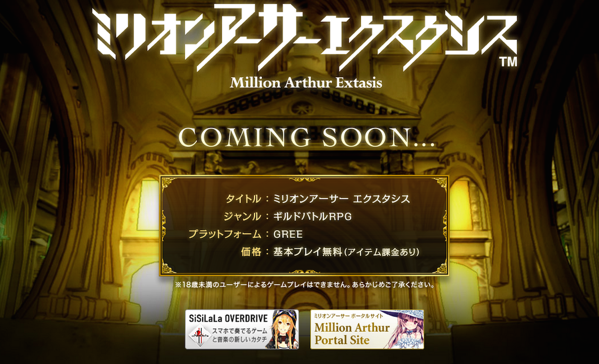 ถือเป็นหน้าใหม่สำหรับวงการเกมของค่ายชื่อดัง Sqaure Enix กับเกมบนสมาร์ทโฟนสำหรับผู้เล่นที่อายุ 18 ปีขึ้นไป ซึ่งเกมดังกล่าวมีชื่อว่า Million Arthur Extasis จากซีรีย์เกม Million Arthur ที่มีออกมาแล้วหลายภาคทั้งบนเครื่องคอนโซลและสมาร์ทโฟน โดยเกมนี้ถูกจัดอยู่ในเรท CERO Z หรือสำหรับผู้เล่นที่มีอายุ 18 ปีขึ้นไป ซึ่งตัวเกมเป็นแนวแบทเทิลอาร์พีจีที่พัฒนาโดยค่าย GREE จะเริ่มปล่อยดาวน์โหลดทั้งบน iOS และ Android ในประเทศญี่ปุ่นเป็นที่แรกเช่นเคยในเร็วๆนี้ สำหรับภาพสกรีนช็อตนั้นตอนนี้ยังไม่มีมาให้ชมกันมีเพียงหน้าทีเซอร์เท่านั้น