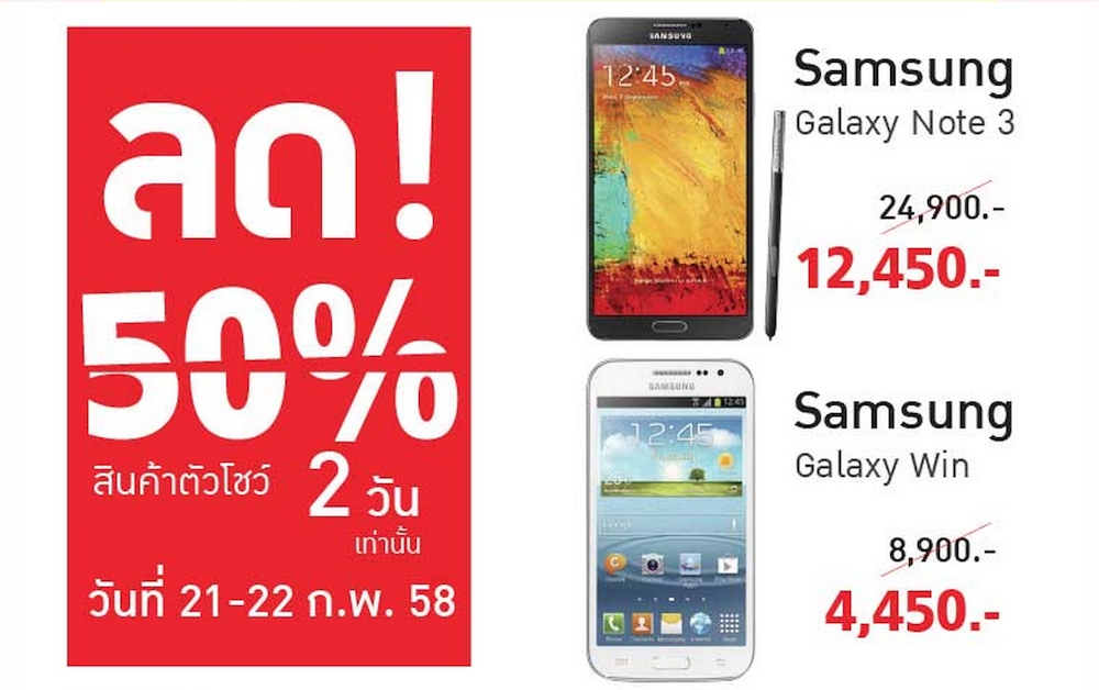 - เมื่อซื้อสมาร์ทโฟน Samsung Galaxy Note 3 ปกติราคา 24,900 บาท เหลือเพียง 12,450 บาท