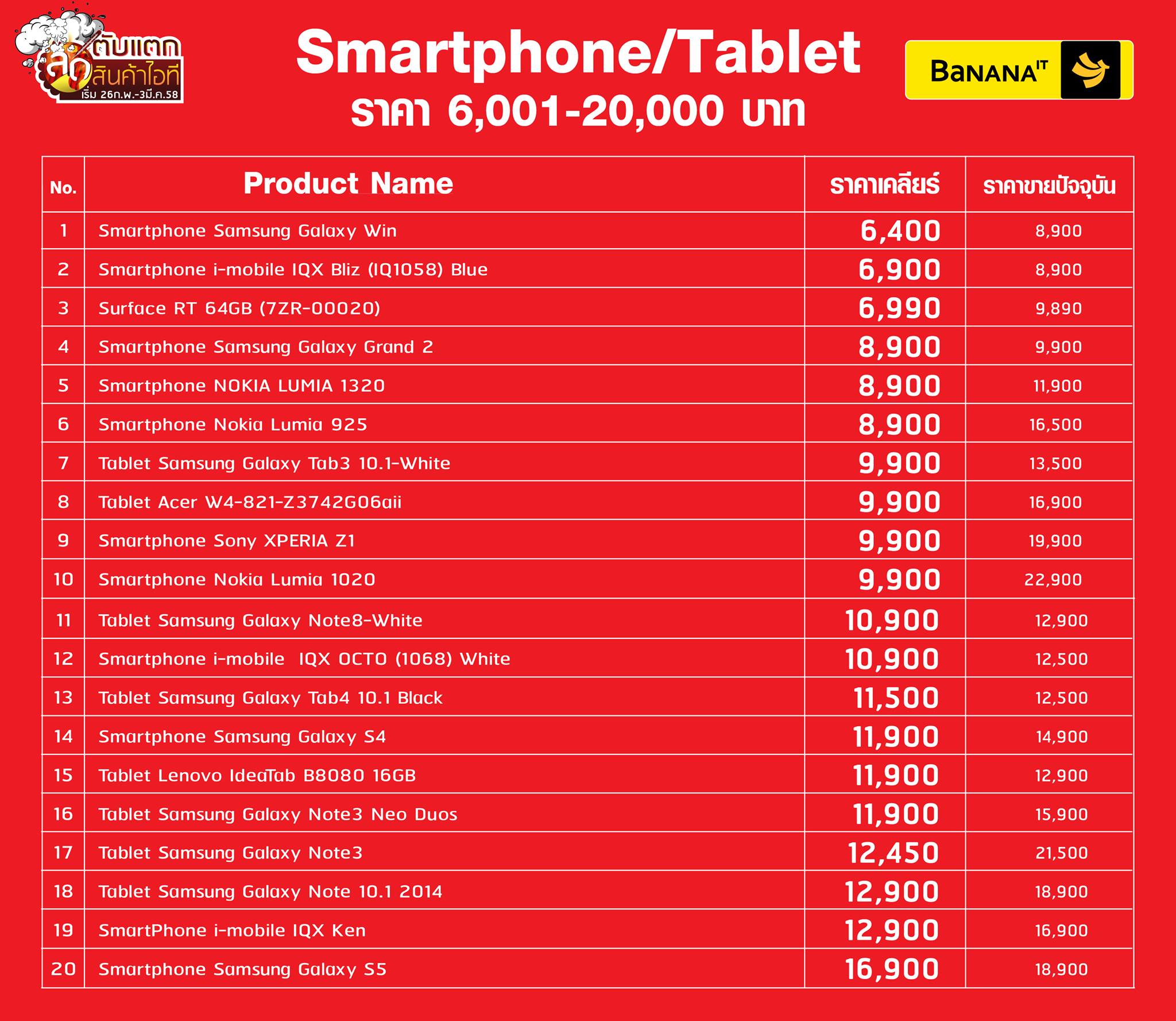 แบ่งเป็นสมาร์ทโฟนและแท็บเล็ตรุ่นราคาไม่เกิน 3,000 บาท ,ราคา 3,001 – 6,000 บาท และ 6,001 – 20,000 บาท ซึ่งจะมีรุ่นไหนโดนใจให้เตรียมไปจับจองกันบ้างดูได้จากตารางราคาด้านล่างได้เลย