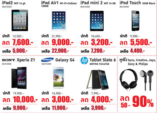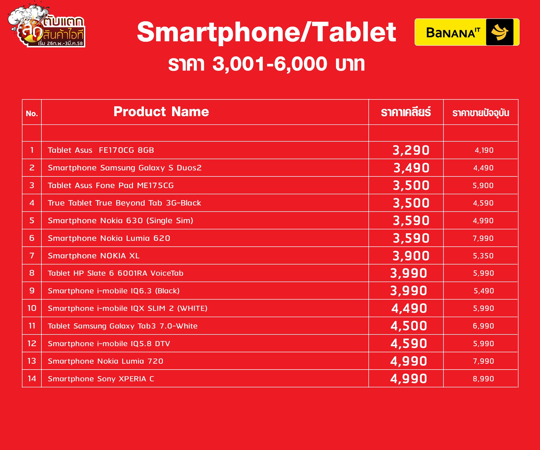 อัพเดทตารางราคาสมาร์ทโฟนและแท็บเล็ตลดพิเศษกับงาน BaNANA IT “ลดตับแตก” รุ่นเก่าต้องเคลียร์เพราะรุ่นใหม่มาเคลียร์สินค้าไอทีปีที่แล้วลด 30-90% ลดครั้งใหญ่ ที่สี่แยกกล้วยน้ำไท ถนนพระราม 4 ตั้งแต่วันที่ 26 กุมภาพันธ์ – 3 มีนาคม 2558 (6 วัน) เวลา 10.00-19.00 น.และ ช้อปต่อเนื่องทุกวันตั้งแต่ 26 กุมภาพันธ์ เป็นต้นไป ที่ The Mall บางแค ชั้น2 เวลา 10.30-22.00 น.