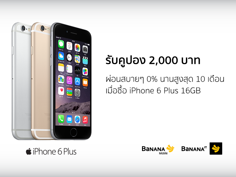 บานาน่าไอที ให้คุณช้อป iPhone 6 Plus รุ่น 16 GB เครื่องเปล่า พร้อมโปรสุดคุ้ม พร้อมรับคูปองส่วนลดอุปกรณ์เสริม มูลค่า 2,000 บาท เพื่อใช้ซื้ออุปกรณ์เสริมภายในร้านบานาน่าไอที และ บานาน่าโมบาย เติมเต็มการใช้งานที่หลากหลาย และยังให้คุณเป็นเจ้าของได้ง่ายกับการผ่อน 0% นานสูงสุด 10 เดือนกับธนาคารที่ร่วมรายการ เริ่มแล้ววันนี้ – 28 กุมภาพันธ์ 2558 เท่านั้น