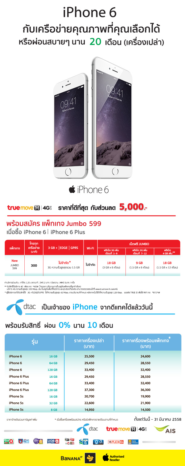 บานาน่าไอที ให้คุณซื้อ iPhone 6 พร้อมแพ็คเกจที่คุณเลือกได้กับเครือข่ายคุณภาพ AIS, True, dtac หรือเลือกซื้อเครื่องเปล่า พร้อมผ่อนสบาย ๆ นาน 20 เดือน กับธนาคารที่ร่วมรายการ พิเศษ!! สำหรับลูกค้า Truemove H รับส่วนลด 5,000 บาท พร้อมสมัครแพ็คเกจ Jumbo 599 สำหรับลูกค้า dtac รับสิทธิ์ผ่อน 0% นาน 10 เดือน ในราคาเริ่มต้นเพียง 24,600 บาท