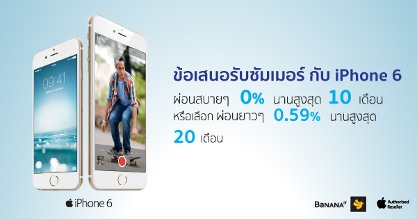 ให้คุณเป็นเจ้าของ iPhone 6 ได้ง่าย ๆ ในหน้าร้อนนี้ กับโปรโมชั่นผ่อนสบาย ๆ 0% นานสูงสุด 10 เดือน หรือเลือกผ่อนยาว ๆ 0.59% นานสูงสุด 20 เดือน กับธนาคารที่ร่วมรายการ ที่ร้านบานาน่าไอที ทั่วประเทศ ตั้งแต่วันที่ 1 – 30 เมษายน 2558