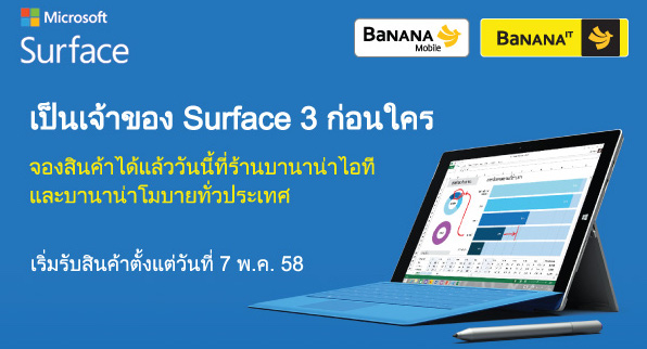 เตรียมตัวเป็นเจ้าของ Surface 3 ลงตัวทั้งสมรรถนะ และความคุ้มค่า เปิดรับจองแล้ววันนี้ที่ร้านบานาน่าไอที และ บานาน่าโมบายทั่วประเทศ