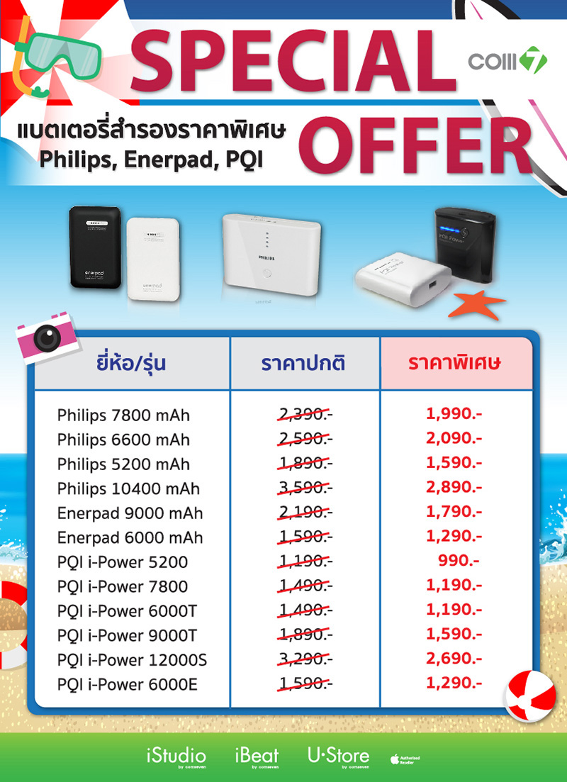 โปรโมชั่นพิเศษ แบตเตอรี่สำรองจากแบรนด์ดัง Philips , Enerpad , PQI ลดราคาพิเศษรับซัมเมอร์ ตั้งแต่วันนี้เป็นต้นไปที่ iStudio iBeat และ U.Store by comseven ทั่วประเทศ