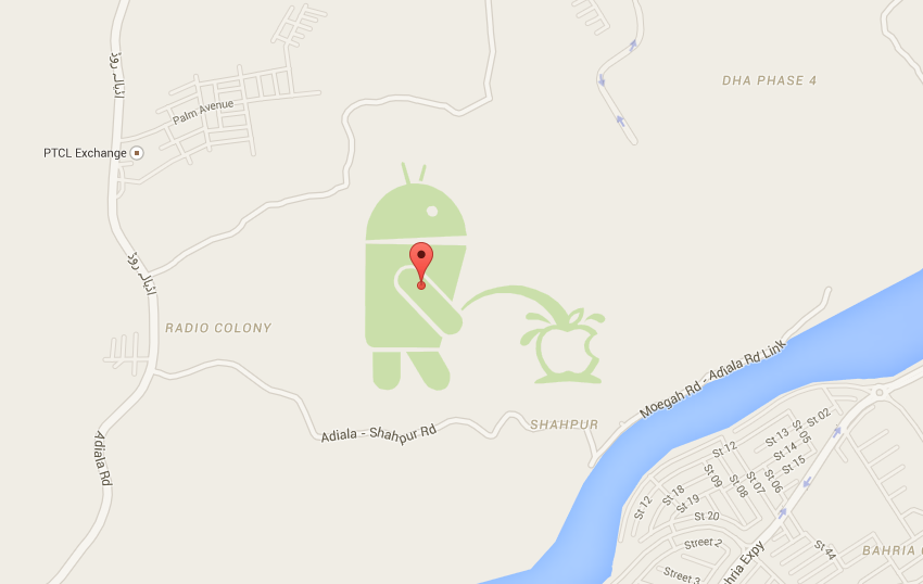 กลายเป็นเรื่องฮือฮาบนโลกออนไลน์เมื่อมีคนไปพบรูปหุ่น Android สีเขียวฉี่ใส่โลโก้ Apple บนแผนที่ Google Maps ในมุมมองแบบแผนที่ โดยรูปดังกล่าวอยู่ในพิกัดแถวๆเมือง Rawalpindi ประเทศปากีสถาน