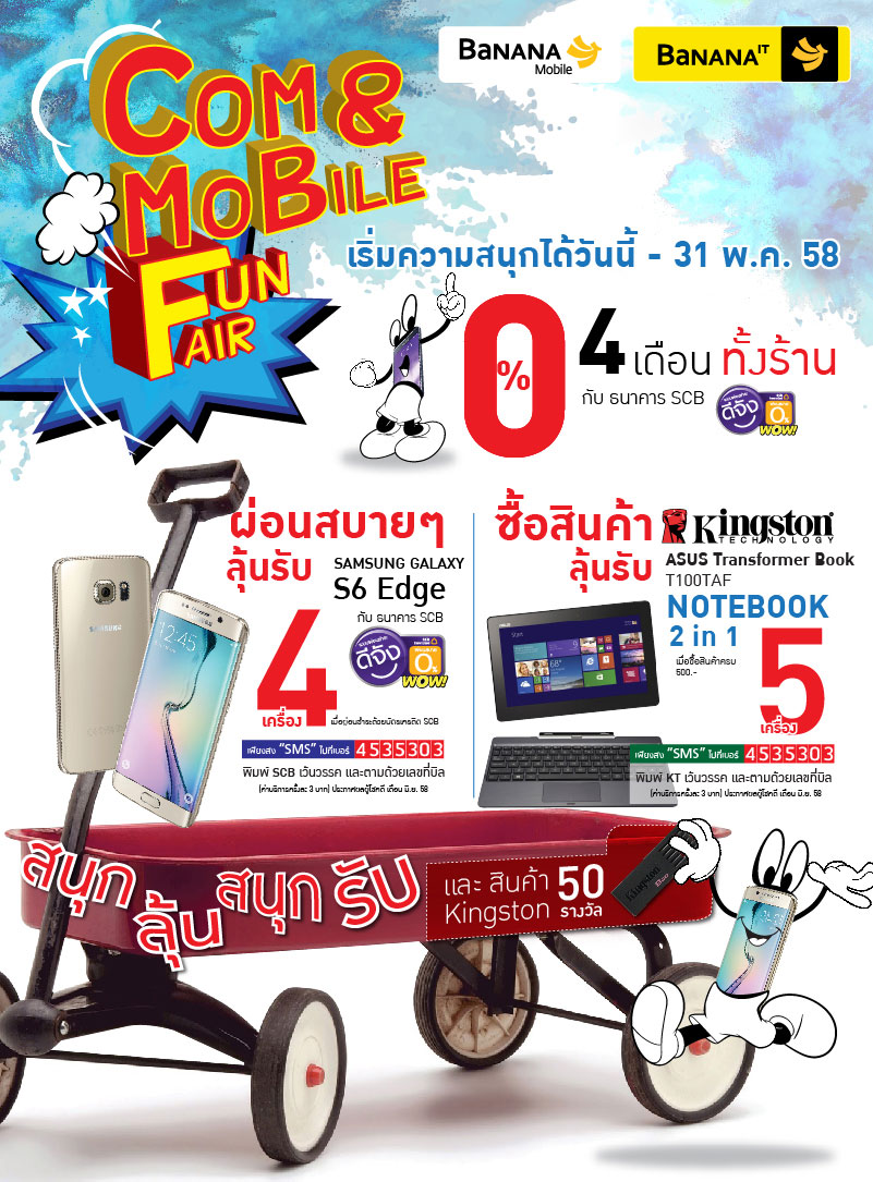 เริ่มต้นความสนุกไปกับเดือนใหม่ด้วยสินค้าไอทีหลากหลายแบรนด์ดัง ที่ขนขวบนมาให้คุณช้อปสนุกเป็นเจ้าของกันง่ายๆ ลุ้นรับ Samsung Galaxy S6 Edge เพียงช้อปสินค้าภายในร้านผ่านบัตรเครดิต SCB แล้วส่ง SMS มาร่วมสนุก, ลุ้นรับ Notebook 2 in 1 Asus t100taf-dk010b เมื่อซื้อสินค้า Kingston ครบ 500 บาท แล้วส่ง SMS มาร่วมสนุก พร้อมรับของรางวัลพิเศษจาก Kingston อีก 50 รางวัล พร้อมโปรฯ ผ่อนสบายๆ 0% นานสูงสุด 4 เดือน (กับธนาคาร SCB)