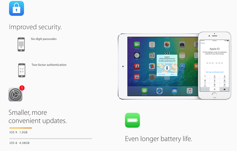 นอกจากนี้ยังมีส่วนของการปรับปรุงประสิทธิภาพในส่วนอื่นเพิ่มเติมไม่ว่าจะเป็นการใช้แบตเตอรี่ได้ยาวนานมากยิ่งขึ้น , ความสามารถในการอัพเดทที่ใช้พื้นที่น้อยกว่าเดิม โดย iOS 9 ใช้พื้นที่ในการอัพเกรด 1.3GB ในขณะที่ iOS 8 จะใช้พื้นที่ในการอัพเกรดถึง 4.58GB , เพิ่มประสิทธิภาพในการตอบสนองการใช้งานให้เร็วและแม่นยำมากยิ่งขึ้น , ปรับปรุงด้านความปลอดภัยในการใช้งาน โดยเพิ่มการใส่โค้ดหรือ passcode เป็นทั้งหมด 6 หลัก และการเพิ่มขั้นตอนในการยืนยันตัวตนเป็น Two-factor authentication