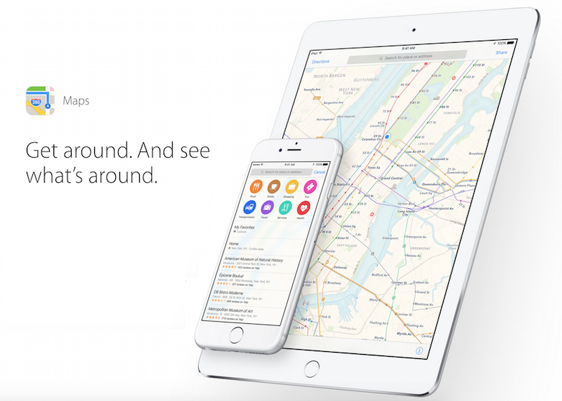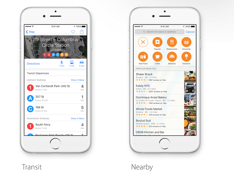 Maps แอพพลิเคชั่นแผนที่บน iOS 9 ได้มีการเพิ่มคุณสมบัติในการเพิ่มข้อมูลของบริการรถสาธารณะหรือ Public Transportation ของแต่ละเมืองเข้ามาเพิ่มเติม ซึ่งจะมีการแสดงผลให้เห็นถึงเส้นทางและสถานีต่างๆ นอกจากนั้นระหว่างเส้นทางจุดต่างๆยังได้มีการเพิ่ม Nearby Feature เข้าไปเพื่อให้ได้เห็นข้อมูลของร้านค้า และร้านอาหารต่างๆ ตามเส้นทาง