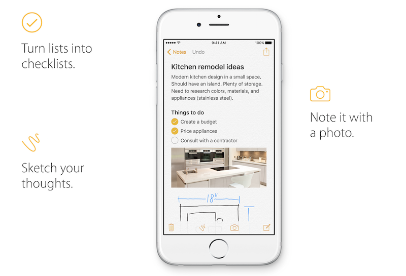Notes แอพพลิเคชั่นที่คุ้นตากันเป็นอย่างดี แต่สำหรับบนระบบปฎิบัติการ iOS 9 ได้มีการปรับปรุงและพัฒนาประสิทธิภาพในการใช้งานให้ดียิ่งขึ้น ด้วยความสามารถในการเพิ่มคอนเทนต์ต่างๆ บนหน้าเว็บไซต์ผ่านทาง Safari ซึ่งจะปรากฎปุ่ม Share ขึ้นมาเพื่อที่จะสามารถนำรูปภาพ แผนที่ URL หรือเอกสารต่างๆ นอกจากนี้ยังสามารถเพิ่มปุ่ม check list เข้ามาใช้งานเพิ่มเติม รวมถึงยังสามารถใช้มือเขียนเป็นลายมือ หรือสเก็ตเป็นตัวอักษร หรือรูปภาพต่างๆได้อีกด้วย