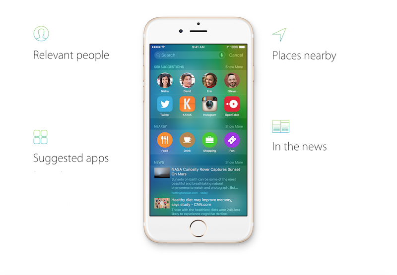 Siri บน iOS 9 นั้นได้มีการปรับปรุงประสิทธิภาพให้สามารถค้นหาข้อมูลได้ฉลาดมากขึ้นกว่าเดิม มีการค้นหาได้ลึกกว่าเดิม ยกตัวอย่างเช่นการค้นหาคลิปวีดีโอโดยใช้คำสั่งเพียงแค่ “Show me videos I took at Iva’s birthday party.” หรือการใช้คำสั่ง “Remind me about this when I get to my car.” ซึ่งจะทำการแจ้งเตือนสิ่งที่กำลังทำค้างอยู่ในแอพพลิเคชั่นนั้นๆ ในขณะนั้น ยกตัวอย่างเช่นการเล่นเว็บค้างอยู่บน Safari หรือพิมพ์ email ค้างอยู่ Siri จะแจ้งเตือนเมื่อถึงสถานที่หรือเวลาที่บอกไว้ในคำสั่ง พร้อมกับจะทำกิจกรรมของแอพพลิเคชั่นที่ค้างนั้นต่อในทันที