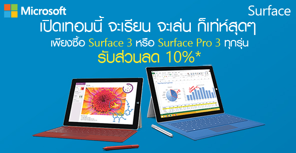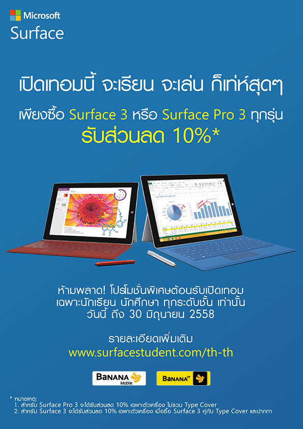 บานาน่าไอที และบานาน่าโมบาย ขอมอบสิทธิพิเศษต้อนรับเปิดเทอม สำหรับน้อง ๆ นักศึกษา รับส่วนลด 10% เพื่อซื้อ Microsoft Surface Pro 3 รุ่น i5 หรือ i7 ในราคาพิเศษ