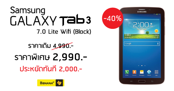 ลดจัดหนัก ประหยัดทันที 2,000 บาท !! Samsung Galaxy Tab 3 WiFi (Black) จากราคา 4,990 บาท เหลือเพียง 2,990 บาท เมื่อช้อปออนไลน์กับบานาน่าไอที เครื่องใหม่รับประกันศูนย์ 1 ปี *สินค้าจำนวนจำกัด