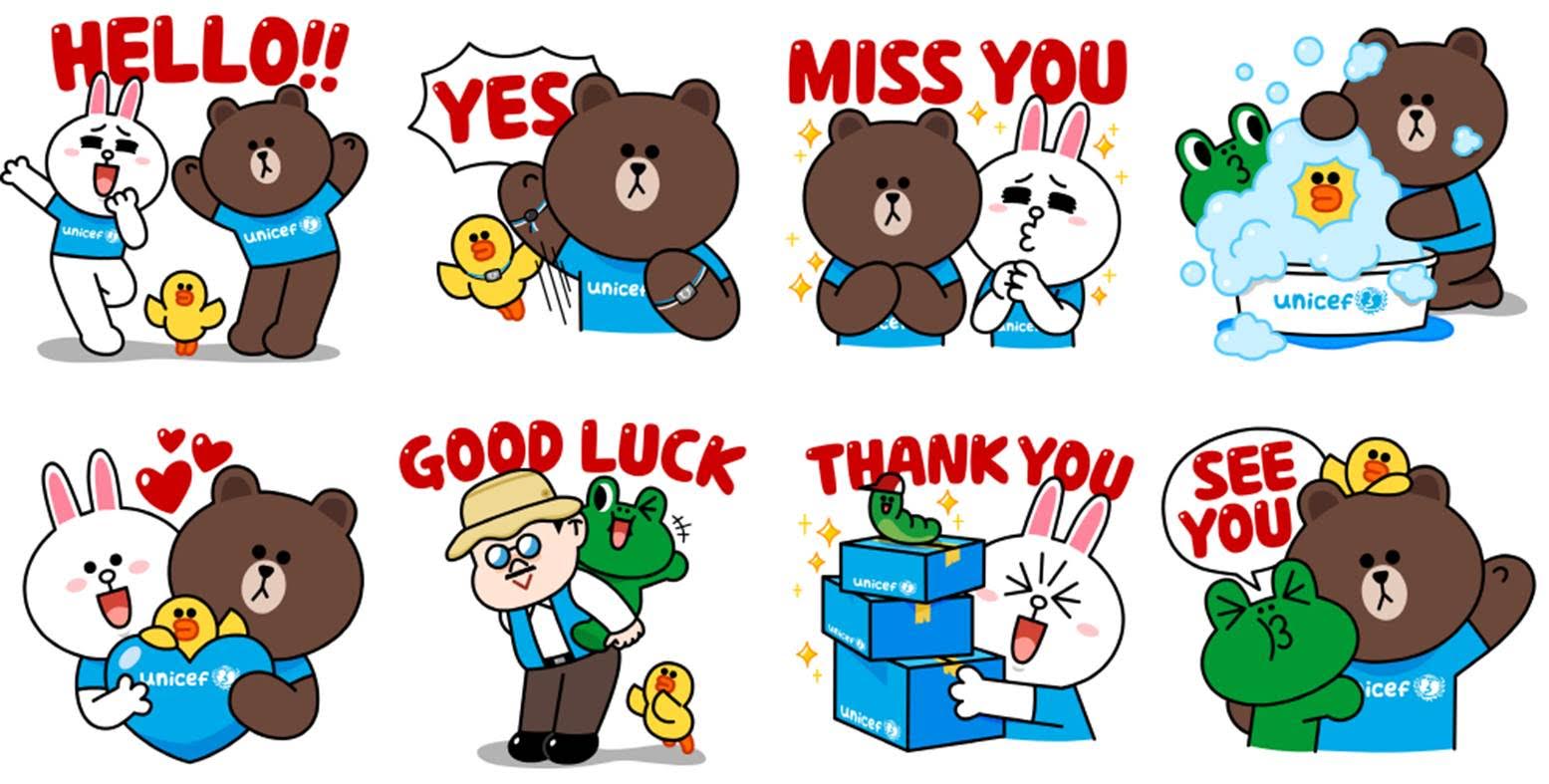 สติกเกอร์ชุด LINE x UNICEF : เซ็ตพิเศษ ประกอบด้วยสติกเกอร์คาแรคเตอร์ LINE ทั้งหมด 8 ตัว โดยสติกเกอร์ชุดนี้เป็นอีกหนึ่งความร่วมมือระหว่าง LINE กับยูนิเซฟ ในการสร้างการรับรู้และสนับสนุนการช่วยเหลือเด็กผู้ด้อยโอกาส ทุนที่ได้จากการขายสติกเกอร์ในอนาคตหรือกิจกรรมต่างๆ ที่จะเกิดขึ้น จะนำไปบริจาคให้กับโครงการของยูนิเซฟ เพื่อจัดเตรียมผลิตภัณฑ์/เครื่องมือในการรักษา วัคซีน น้ำ อาหาร รวมถึงปัจจัยทางด้านการศึกษา การป้องกันต่างๆ และเครื่องมือบรรเทาสาธารณภััยต่างๆ เมื่อยามจำเป็น เป็นต้น ทั้งนี้ LINE กับยูนิเซฟ ได้ตกลงเป็นพันธมิตรร่วมกันเพื่อสนับสนุนกองทุนนี้ ด้วยการพัฒนาและจำหน่ายสติกเกอร์ LINE รวมถึงลิขสิทธิ์คาแรคเตอร์สติกเกอร์ดังกล่าวมาตั้งแต่เดือนกุมภาพันธ์ 2558 ที่ผ่านมา และในครั้งนี้ LINE ยังเปิดให้ผู้ใช้ได้ร่วมบริจาคด้วย “Free Coins” ได้อีกด้วย Free Coins คือเหรียญฟรีจาก LINE ที่ผู้ใช้สามารถรับได้จากการปฎิบัติตามเงื่อนไขต่างๆ ที่กำหนดไว้ เช่น ดูคลิปวิดีโอหรือดาวน์โหลดแอพต่างๆ ที่มีการแจกเหรียญ เป็นต้น
