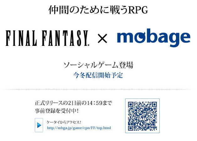 สแควร์เอนิกซ์ จับมือกับบริษัท DeNA ผู้พัฒนาเกมโซเชียลของญี่ปุ่น ร่วมกันสร้างเกมอาร์พีจีโซเชียลตัวแรกที่ใช้ตัวละครจากซีรีย์ไฟนอลแฟนตาซีลงเครื่องโทรศัพท์มือถือเฉพาะที่ญี่ปุ่น บริษัทสแควร์เอนิกซ์ ได้ประกาศเปิดตัวเว็บไซต์สำหรับโปรเจกต์เกมตัวใหม่ที่ใช้ชื่อว่า “Final Fantasy x Mobage” โดยระบุว่าเป็นโปรเจกต์เกมอาร์พีจีที่ร่วมมือกับทาง DeNA บริษัทพัฒนาเกมโซเชียลชื่อดังของญี่ปุ่น ซึ่งมีคอนเซปต์เป็นเกมอาร์พีจีที่ผู้เล่นต้องต่อสู้เพื่อเพื่อน