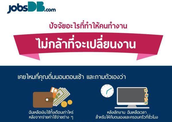 บริษัท จัดหางาน จ๊อบส์ ดีบี (ประเทศไทย) จำกัด เผยผลสำรวจล่าสุดในหัวข้อ “ปัจจัยที่ทำให้คนทำงานอยากเปลี่ยนงาน และไม่กล้าที่จะเปลี่ยนงาน” ประจำปีพ.ศ. 2558 พบว่า เหตุผลหลักที่ทำให้คนทำงานไม่กล้าเปลี่ยนงาน คือความรู้สึกกังวลเรื่องวัฒนธรรมองค์กร และสภาพแวดล้อมในที่ทำงาน 41% ในขณะที่ 92% ของคนทำงานคิดว่าการเปลี่ยนงานทำให้มีความสุขมากขึ้น