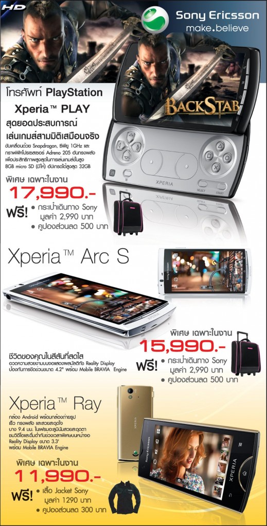 Sony Ericsson Xperia Arc S รุ่นใหม่ล่าสุดวางจำหน่ายแล้วราคาพิเศษ 15,990 บาทเท่านั้น เฉพาะในงาน สยามทีวี Mobile Expo 2011 จังหวัดเชียงใหม่ รับฟรีกระเป๋าเดินทาง Sony มูลค่า 2,990 บาท และคูปองส่วนลด 500 บาท สำหรับ Xperia PLAY และ Xperia Ray ก็มาจัดโปรโมชั่นเช่นกัน