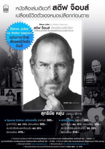 Nationbook ได้ลิขสิทธิ์จัดจำหน่ายหนังสือชีวประวัติของ Steve Jobs ที่เขียนโดย Walter Isaacson เป็นฉบับภาษาไทย ในชื่อ “สตีฟ จ็อบส์ อัจฉริยะพลิกโลก” มีสุทธิชัย หยุ่น เป็นบรรณาธิการหนังสือ ซึ่งมีการจำหน่าย 2 แบบ 2 ราคาคือแบบปกแข็งและปกอ่อน ถ้าจองตอนนี้จะได้ส่วนลด 15% มีราคาดังนี้