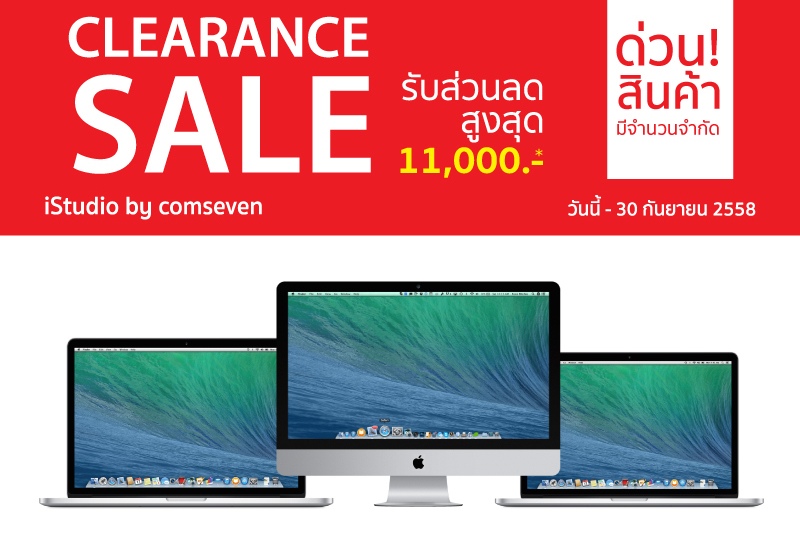 Clearance Sale ลดกระหน่ำ ล้างสต๊อกผลิตภัณฑ์ Mac อาทิ MacBook Pro จอภาพ Retina 13″, 15″ และ iMac 27″ รับส่วนลดสูงสุด 11,000.- ที่ iStudio by comseven ทั่วประเทศ ตั้งแต่วันนี้ – 30 ก.ย. 58