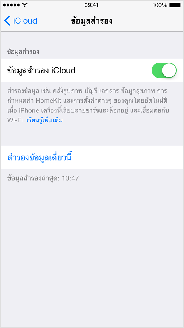 เชื่อมต่ออุปกรณ์ iOS กับ Wi-Fi ให้เรียบร้อยสำหรับผู้ที่ใช้งาน iOS 8 ขึ้นไปให้ไปที่ Settings > iCloud > Backup > Back Up Now เชื่อมต่อกับ Wi-Fi จนกว่ากระบวนการสำรองข้อมูลจะเสร็จสมบูรณ์ เมื่อเสร็จเรียบร้อยแล้วตรวจสอบให้แน่ใจว่าการสำรองข้อมูลเสร็จเรียบร้อยแล้วโดยไปดูที่ Settings > iCloud > Storage > Manage Storage แล้วเลือกอุปกรณ์ที่สำรองข้อมูลเมื่อสักครู่ ข้อมูลสำรองที่เพิ่งจะปรากฏพร้อมด้วยรายละเอียดเกี่ยวกับเวลาและขนาดของข้อมูลสำรองที่นี่