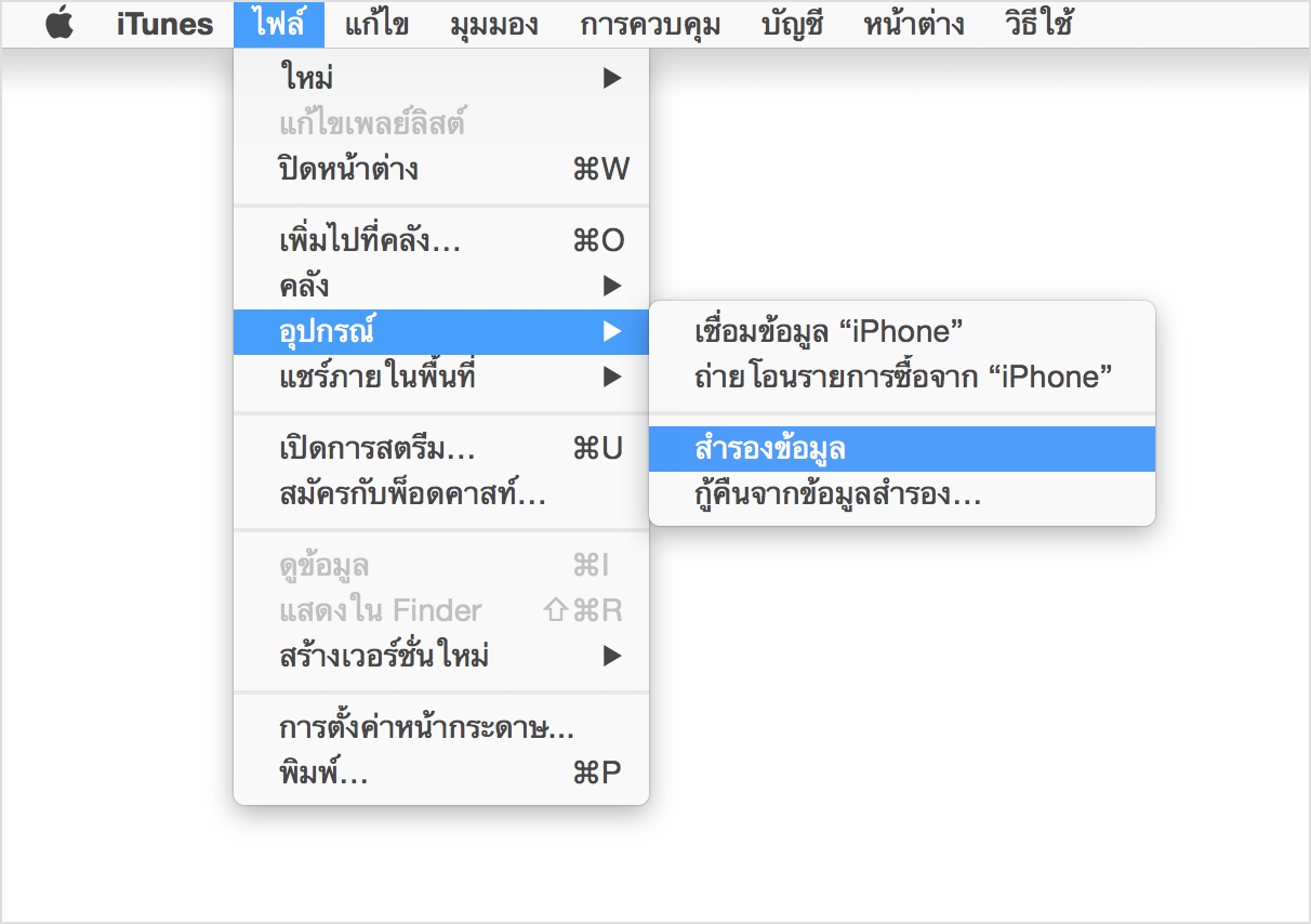 นอกจากจะสำรองข้อมูลสำคัญผ่าน iCloud แบบออนไลน์แล้วเรายังสามารถสำรองข้อมูลบนคอมพิวเตอร์ด้วย iTunes ได้ซึ่งเป็นวิธีดั่งเดิมไม่ต้องง้อ WiFi หรือ อินเตอร์เน็ทอีกด้วยวิธีการก็คือให้เปิด iTunes และเชื่อมต่ออุปกรณ์กับคอมพิวเตอร์ทั้ง Mac และ PC ทำการสำรองแอพหรือเพลงที่ดาวน์โหลดจาก iTunes Store หรือ App Store โดยคลิกที่ File > Devices > Tranfers Purchases (หากใช้ Windows แล้วไม่เห็นเมนู File ให้กดปุ่ม Alt)