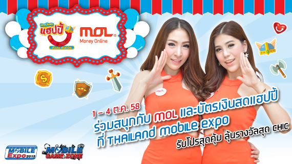 ภาพความสนุก กิจกรรมดีๆ โปรโมชั่นโดนๆ กำลังจะกลับมาอีกครั้งที่งาน Thailand Mobile Expo 2015 วันที่ 1 – 4 ตุลาคม 2558 ณ ศูนย์ประชุมแห่งชาติสิริกิติ์ เพราะที่บูท MOL ร่วมกับบัตรเงินสดแฮปปี้ เตรียมขนเอาความประทับใจจากครั้งที่แล้ว พร้อมยกระดับความสนุกให้เพิ่มขึ้นไปอีก กับค่ายเกมชั้นนำทั้งไทยและต่างประเทศที่จะพาทุกท่านจมหายไปกับเกมสนุกๆ มากมาย ร่วมด้วยโปรโมชั่นเด็ด และกิจกรรมโดนๆ อีกมากมาย อย่าพลาดเรามีนัดกัน มา 4 วันก็สนุกกันเต็มๆ 4 วันจ้า