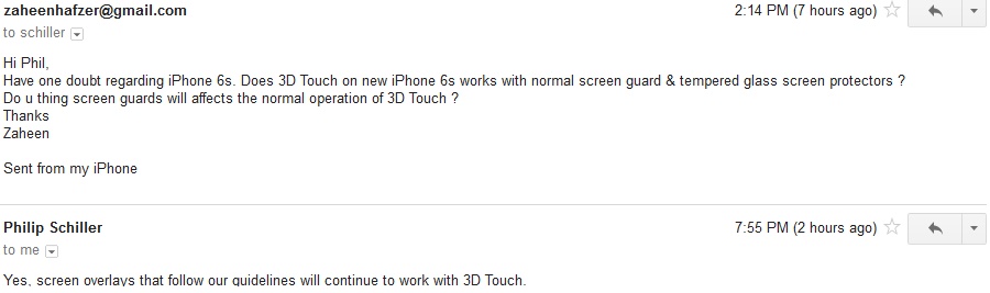 จากข้อสงสัยนี้จึงมีรายงานข่าวออกมาว่าเว็บไซต์ 3DTechtronics ได้ทำการอีเมล์ไปสอบถามกับ Phil Schiller หนึ่งในผู้บริหารจาก Apple ว่า iPhone 6s นั้นจะสามารถใช้งานร่วมกับฟิล์มที่มีจำหน่ายอยู่ในท้องตลาดได้หรือไม่ ซึ่งก็ได้รับการตอบกลับเกี่ยวกับเรื่องนี้ว่า สามารถใช้งานได้โดยไม่เกิดปัญหาแต่อย่างใด หากฟิล์มเหล่านั้นผลิตถูกต้องตามข้อจำกัดที่ Apple เคยแจ้งไปกับทางผู้ผลิตก่อนหน้านี้ โดยข้อจำกัดหลักๆในการผลิตฟิล์มกันรอยนั้นก็คือ ต้องไม่หนาเกิน 0.3 มิลลิเมตร , ต้องไม่ก่อให้เกิดฟองอากาศระหว่างฟิล์มกับผิวสัมผัสบนหน้าจอ และต้องไม่เป็นตัวนำไฟฟ้า ซึ่งนั่นหมายความว่าหากฟิล์มที่ได้รับการผลิตตามมาตรฐานและถูกตามข้อจำกัดของ Apple ก็จะสามารถใช้งานได้อย่างแน่นอน อย่างไรก็ตามจะเห็นได้ว่าเริ่มมีผู้ผลิตบางรายที่ได้เริ่มวางจำหน่ายฟิล์มกันรอยซึ่งสามารถรองรับการใช้งานได้ทั้ง iPhone 6 และ iPhone 6s กันบ้างแล้ว