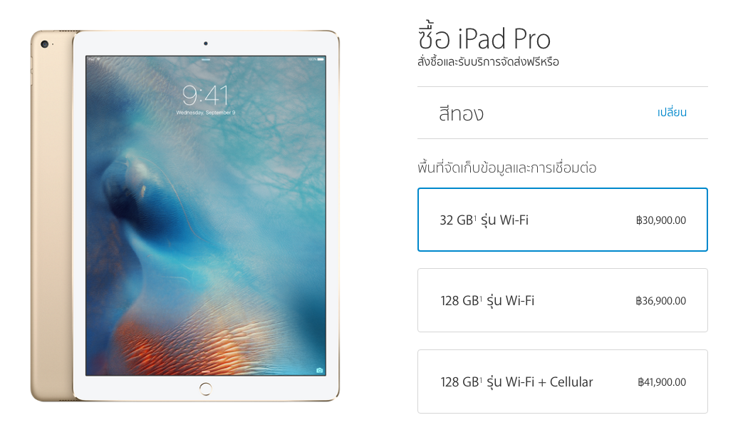 • iPad Pro รุ่น Wi-Fi + Cellular ความจุ 128GB ราคา 41,900 บาท (ยังไม่เปิดจำหน่าย)