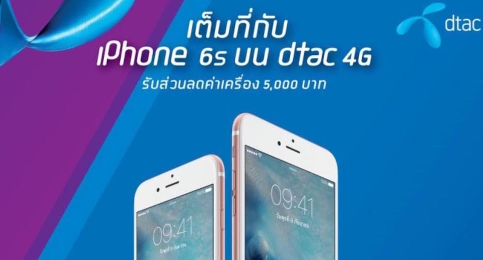dtac จัดโปร iPhone 6s หรือ iPhone 6s Plus ราคาพิเศษรับส่วนลดถึง 5,000 บาท เริ่มต้นที่ 21,900 บาทเท่านั้น เมื่อสมัครแพ็กเกจ Love & Roll Non-Stop 899 ขึ้นไป หรือ Love & Roll เต็ม Max 999 ขึ้นไป พร้อมชำระค่าบริการรายเดือนล่วงหน้า 6 เดือน ระยะเวลาสัญญา 12 เดือน สำหรับลูกค้าปัจจุบัน เปิดเบอร์ใหม่ ย้ายค่ายเบอร์เดิม หรือเปลี่ยนจากเติมเงินเป็นรายเดือน ผ่อน 0% นานสูงสุด 24 เดือน จำกัดสิทธิ์ 1 ท่าน ต่อ 1 เครื่องเท่านั้น วันนี้ถึง 31 ธันวาคม 2558