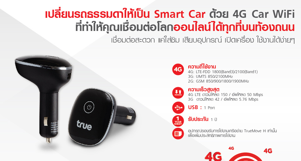 4G Car WiFi เป็นอุปกรณ์เปลี่ยนสัญญาณ 4G ให้เป็น WiFi ฮอตสปอต สำหรับใช้งานบนรถ รองรับการใช้งานบนเครือข่ายทรูมูฟ เอชเท่านั้น รองรับความถี่ 4G: Cat 4 LTE-FDD 1800/2100 MHz รองรับ 3G: UMTS 850/2100 MHz 4G ดาวน์โหลดสูงสุด 150 Mbps / อัพโหลดสูงสุด 50 Mbps 3G ดาวน์โหลดสูงสุด 21.6 Mbps / อัพโหลดสูงสุด 5.76 Mbps รองรับ WiFi 802.11 b/g/n, 2.4 GHz ใช้ไฟ 12V จากที่จุดบุหรี่ในรถ และ USB port 5V/1A สำหรับชาร์จไฟ มี 2 รุ่น คือ แชร์การใช้งานได้สูงสุด 5 อุปกรณ์ และ 10 อุปกรณ์ ในราคา 2,290 บาท และ 2,790 บาท ตามลำดับ