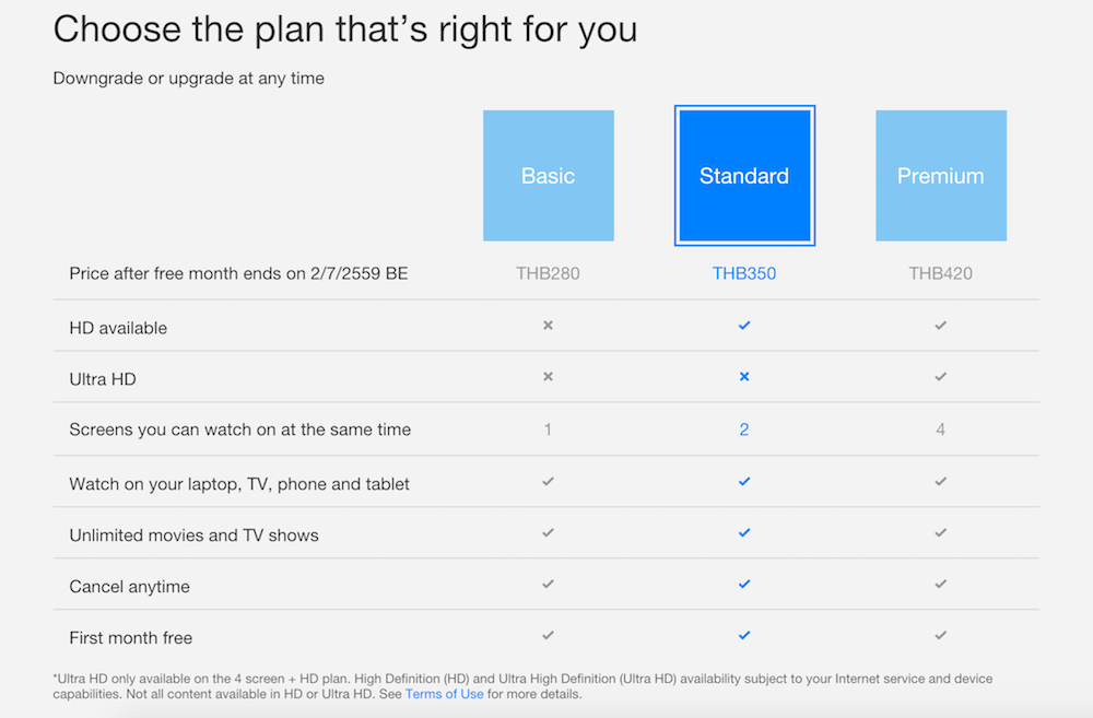 - Standard ราคา 350 บาทต่อเดือน ชมได้ที่ความละเอียด HD พร้อมกันได้ 2 เครื่อง