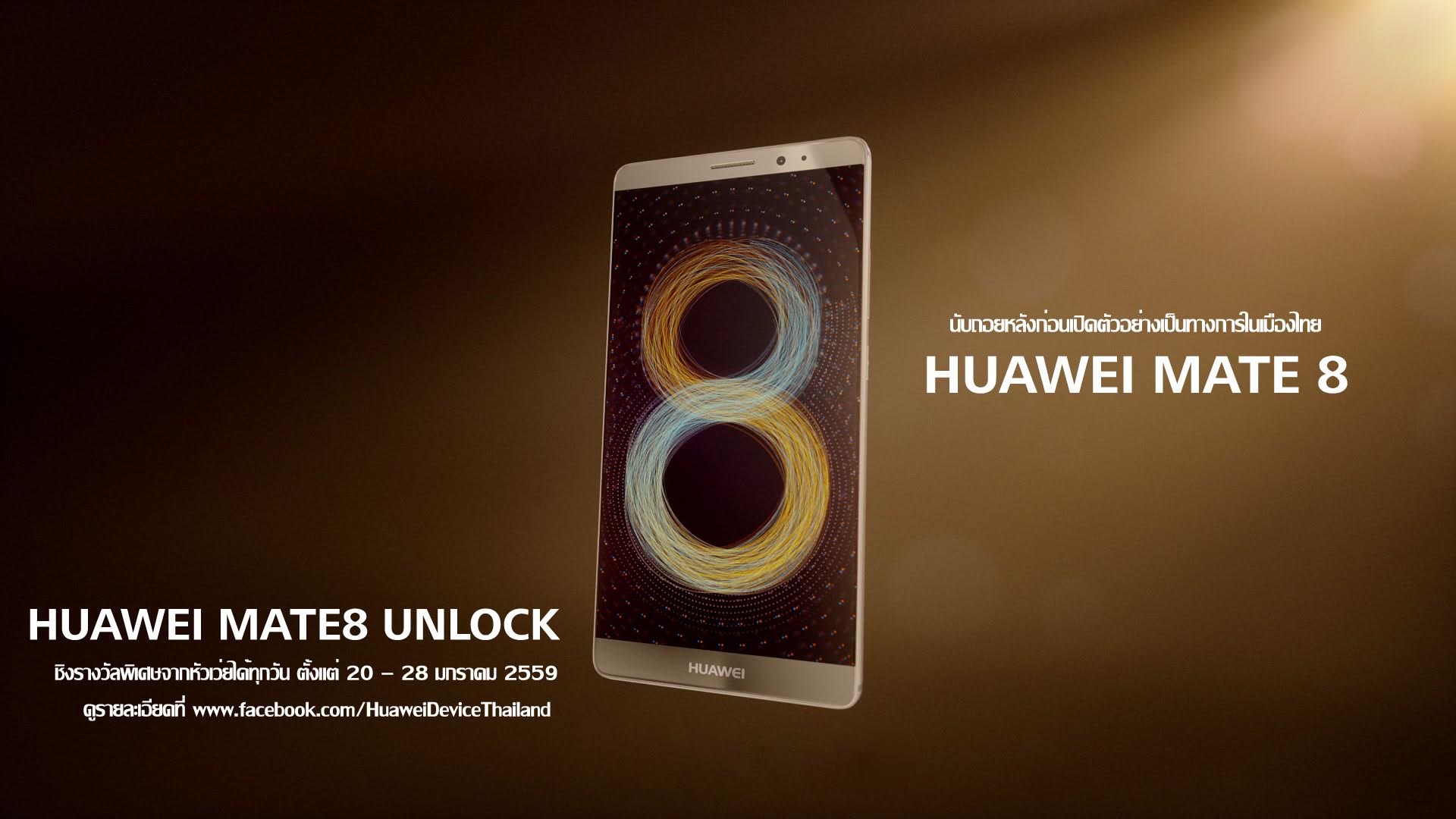 Huawei Mate 8 ชวนร่วมกิจกรรม “Huawei Mate8 Unlock” นับถอยหลังก่อนเปิดตัวอย่างเป็นทางการในเมืองไทย ลุ้นเป็นเจ้าของสมาร์ทโฟนระดับพรีเมี่ยม Huawei Mate 8 ก่อนใคร พร้อมชิงรางวัลพิเศษจากหัวเว่ยได้ทุกวัน ตั้งแต่ 20 – 28 มกราคม 2559