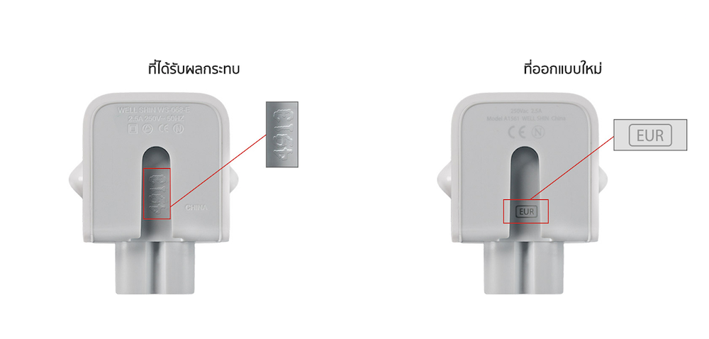 เนื่องจากความปลอดภัยของลูกค้าเป็นเรื่องสำคัญสูงสุดของบริษัท Apple จึงขอให้ลูกค้าหยุดใช้งานอะแดปเตอร์ปลั๊กที่ได้รับผลกระทบดังกล่าว โดยขอแนะนำให้ลูกค้าไปที่ www.apple.com/th/support/ac-wallplug-adapter เพื่อดูรายละเอียดเกี่ยวกับวิธีการเปลี่ยนอะแดปเตอร์ที่ได้รับผลกระทบ เพื่อขอรับอะแดปเตอร์ที่ได้รับการออกแบบขึ้นใหม่