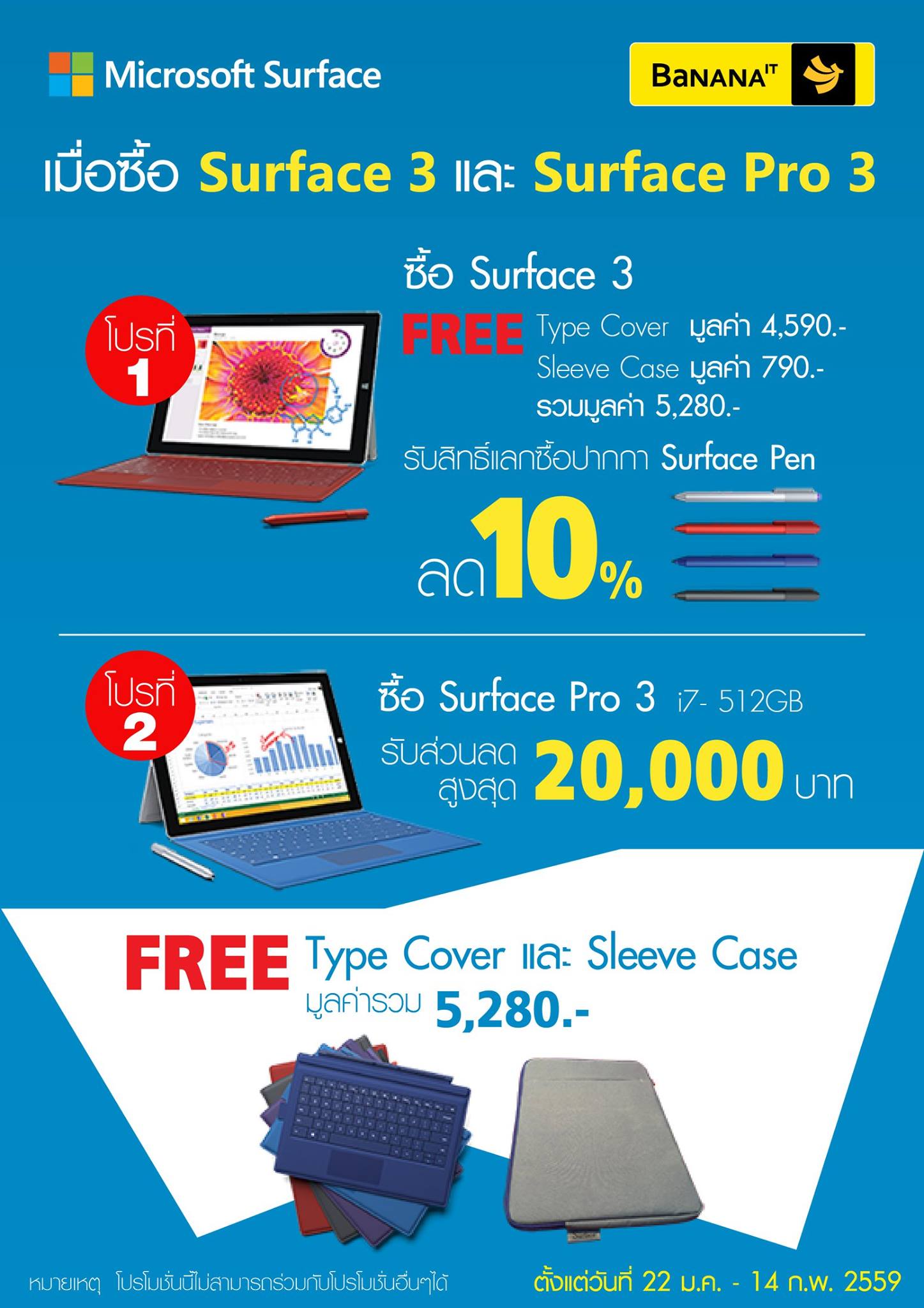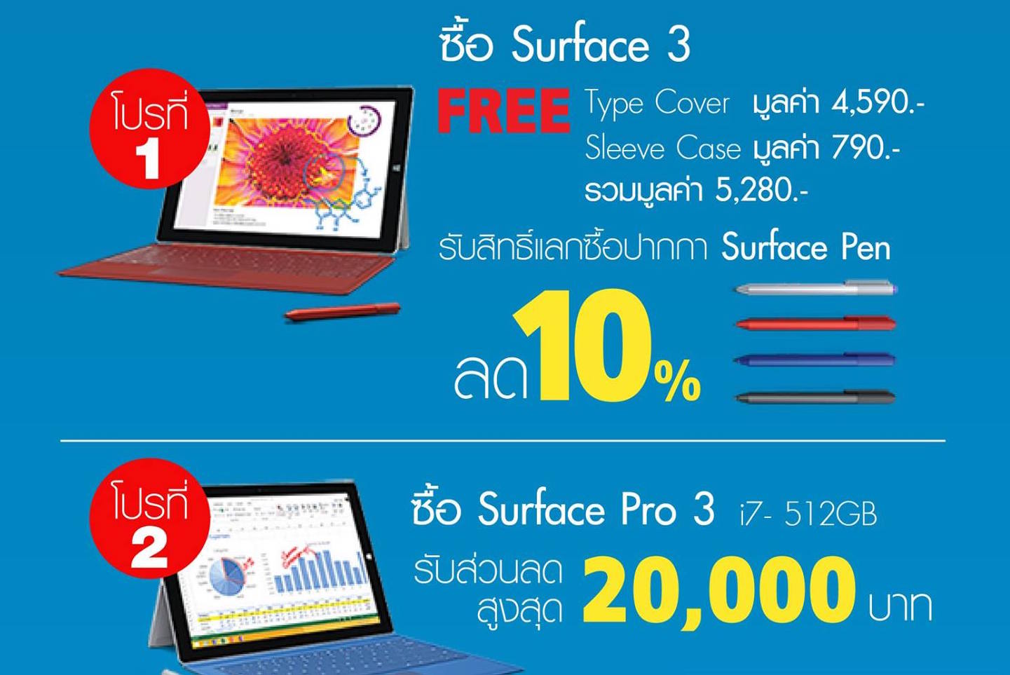 โปรที่ 1 เมื่อซื้อ Surface 3 รุ่นใดก็ได้ รับของแถม Type Cover และ Sleeve case มูลค่า 5,280 บาท ฟรีทันที พร้อมรับสิทธิ์แลกซื้อปากกา ลดทันที 10%