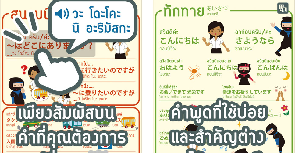 แอปพลิเคชันพูดได้เพียงใช้ปลายนิ้วสัมผัส ตอนที่ไปญี่ปุ่น คุณเคยประสบปัญหาเล่านี้หรือไม่ “ต้องการทักทาย” “ต้องการขอบคุณ” “ต้องการขอวิธีทางไปห้องน้ำ” และอื่น ๆ จะพูดยังไงจะทำยังไงก็ไม่สามารถสื่อสารได้อย่างมีประสิทธิภาพ ต้องการจะพูดแบบนี้ ต้องการจะถามแบบนี้ ก่อนจะไปเที่ยวญี่ปุ่นอยากจะจำคำศัพท์ให้ได้เยอะ ๆ นี่คือแอปพลิเคชันที่ตอบทุกโจทย์ที่คุณต้องการ แอปพลิเคชันนี้ได้บรรจุคำศัพท์ที่คุณต้องการไม่ว่าจะเป็น “การทักทาย” “การกล่าวขอบคุณ” หรือแม้กระทั้งการถามทางไปสถานที่ต่าง ๆ หากคุณเป็นนักท่องเที่ยว หรือแม้กระทั้งผู้ที่กำลังตั้งใจจะเรียนภาษาญี่ปุ่น แอปพลิเคชันนี้คือคำตอบ แม้ในสถานที่ที่ไม่มีอินเตอร์เน็ตก็สามารถใช้ได้เช่นกัน เพียงแค่ใช้ปลายนิ้วสัมผัสบนข้อความที่ต้องการ แอปพลิเคชันนี้จะเป็นคนพูดแทนคุณเอง